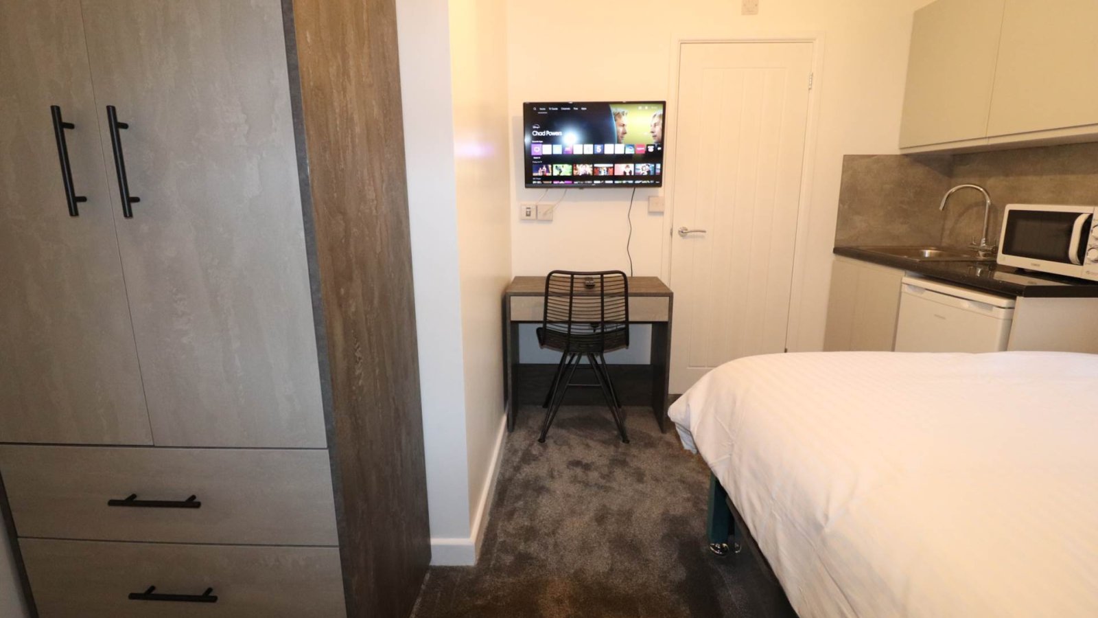 Bedroom with new double bed, high quality mattress, bedding, bedside drawer unit, 2 door wardrobe with 3 drawers, under bed storage box, office desk with 1 drawer, office chair and 32 inch smart TV with Freeview, Netflix and Amazon Prime enabled.