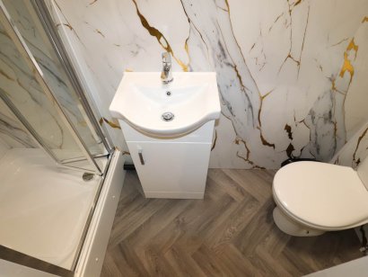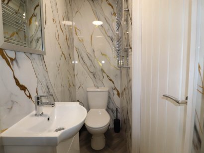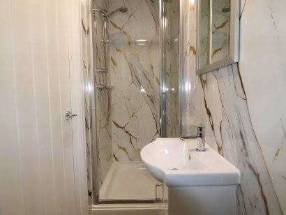 En-suite bathroom with shower cubicle, w/c, handbasin with storage cupboard underneath, mirror and heated towel rail.