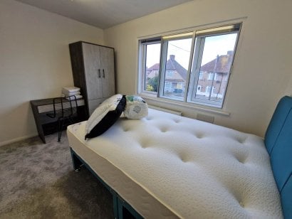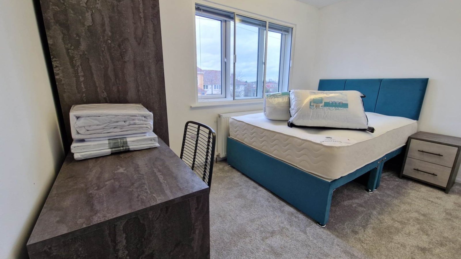 Furniture: A new double bed & new orthapedic mattress, new bedding, bedside drawer, 2 door wardrobe with 3 drawer unit, desk with 1 drawer & chair.