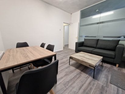 Shared lounge/ dining room with 3 seater sofa, coffee table and dining table with 4 chairs